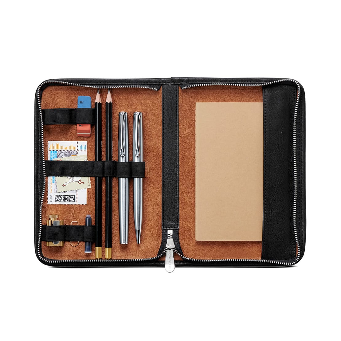 9 loops for 2 pens, 2 fountain pen, 1 eraser, 1 sharpener and 3 more loops for small things · 1 compartment A6 or similar format for postcards or 1 notebook · closed with zip · article without content