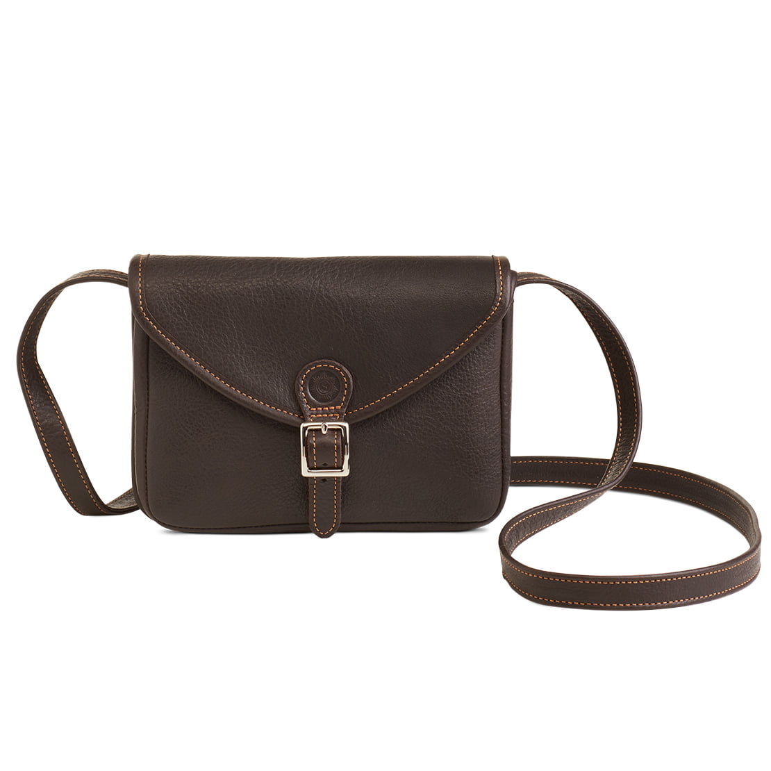 1 main compartment for mobile phone, wallet or other small items ∙ 1 outside front compartment, can be closed with leather tab ∙ Main compartment can be closed with a metal clasp ∙ No lining ∙ 1 leather strap with metal clasp, adjustable length, 1.5 cm wide
