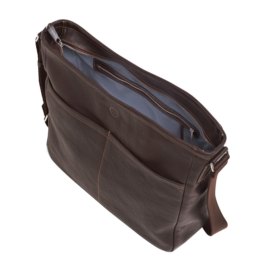 1 main compartment with 1 additional zipped compartment ∙ 3 pockets for phone, pens, purse ∙ 1 leather key leash with metal clip ∙ Zip top ∙ 2 outside front compartments ∙ Adjustable textile strap, 4 cm wide ∙ suitable for A4 documents