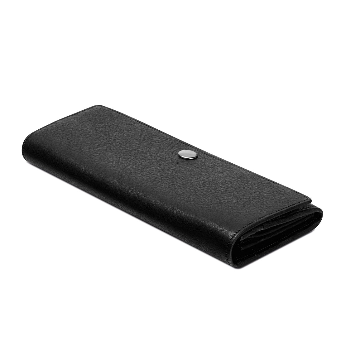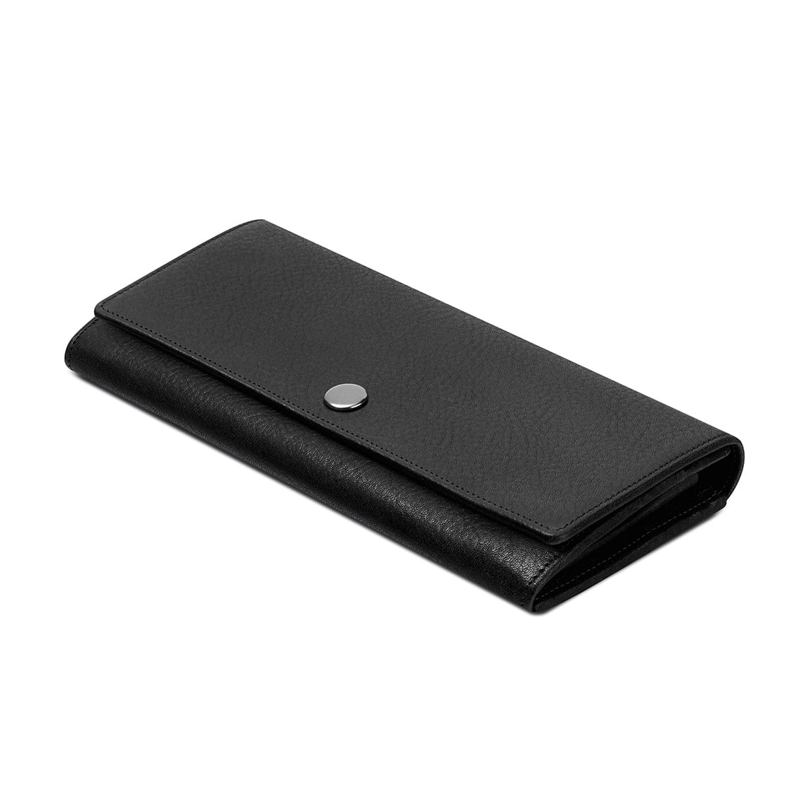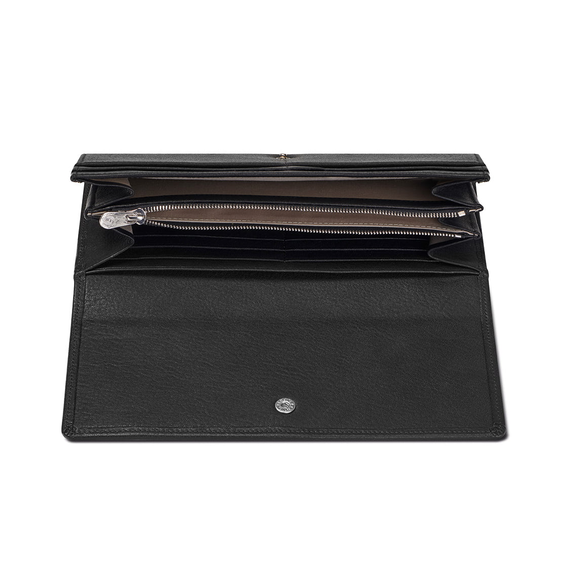 1 coin pouch closed with 1 zip · 6 credit card slots inside, 4 credit card slots outside under flap, 2 note compartments · 1 slot for notes etc., 1 slot outside on the back · Note compartments optionally suitable for smartphone · closed with 1 stud fastener