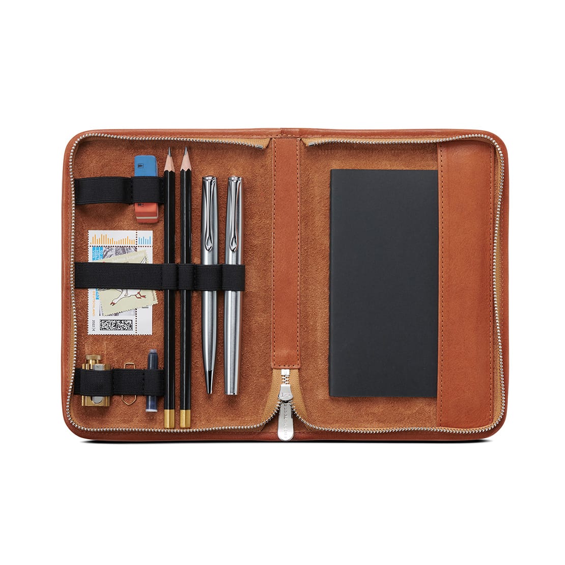 9 Schlaufen für 2 Stifte, 2 Füller, 1 Radierer, 1 Spitzer und 3 weitere für Kleinigkeiten · 1 Steckfach A6 oder ähnliche Formate für Postkarten oder 1 Notizheft · verschließbar durch 1 Reißverschluss · Artikel ohne Inhalt