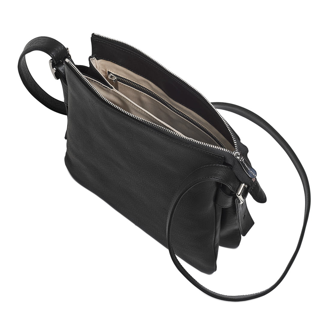 2 Hauptfächer, 1 zusätzliches Reißverschlussfach, 1 Stiftelasche ∙ verschließbar durch 1 Reißverschluss ∙ verstellbarer Ledertrageriemen, 2 cm breit