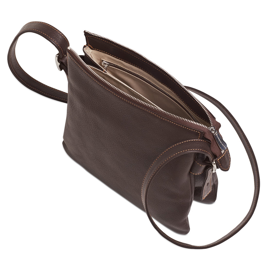 2 Hauptfächer, 1 zusätzliches Reißverschlussfach, 1 Stiftelasche ∙ verschließbar durch 1 Reißverschluss ∙ verstellbarer Ledertrageriemen, 2 cm breit