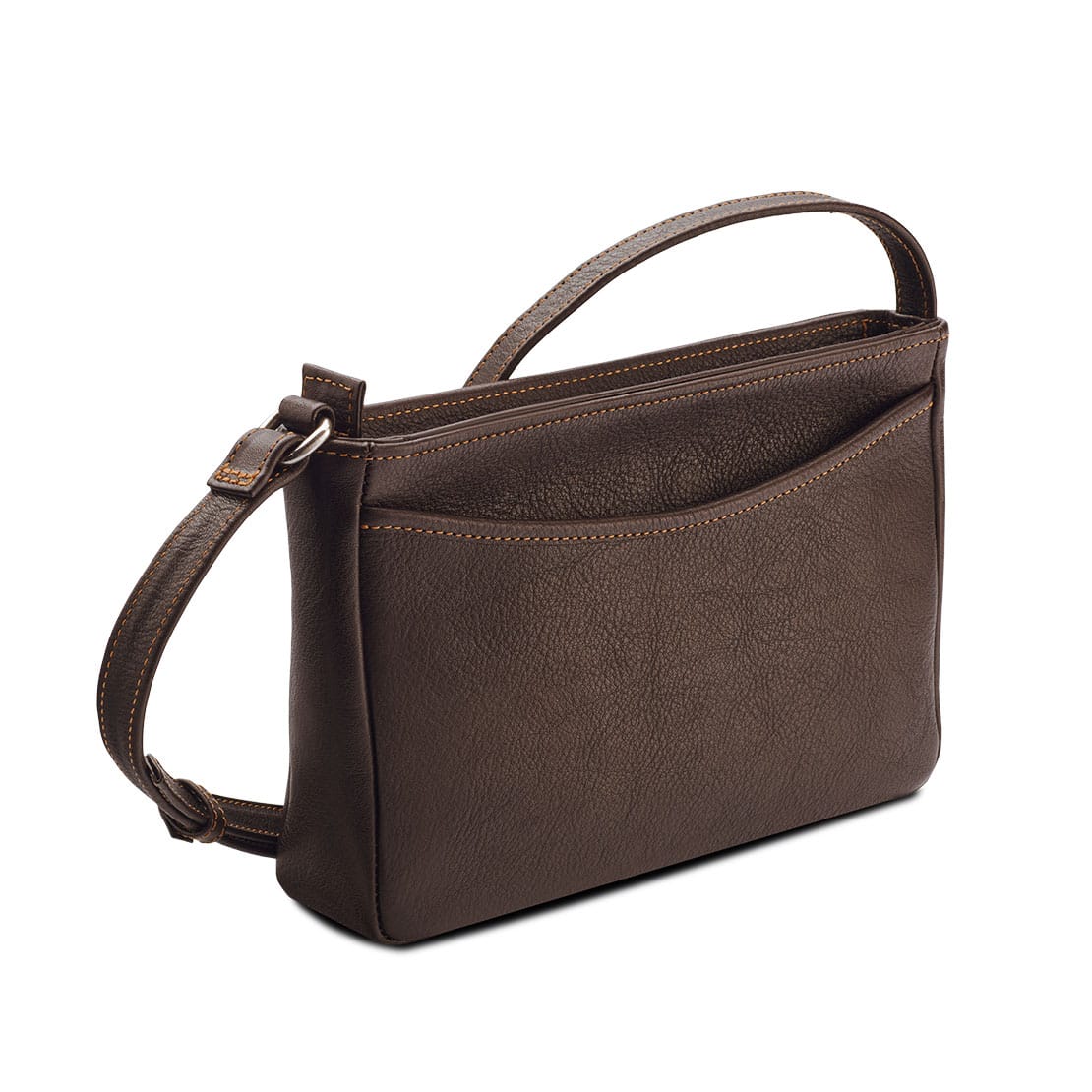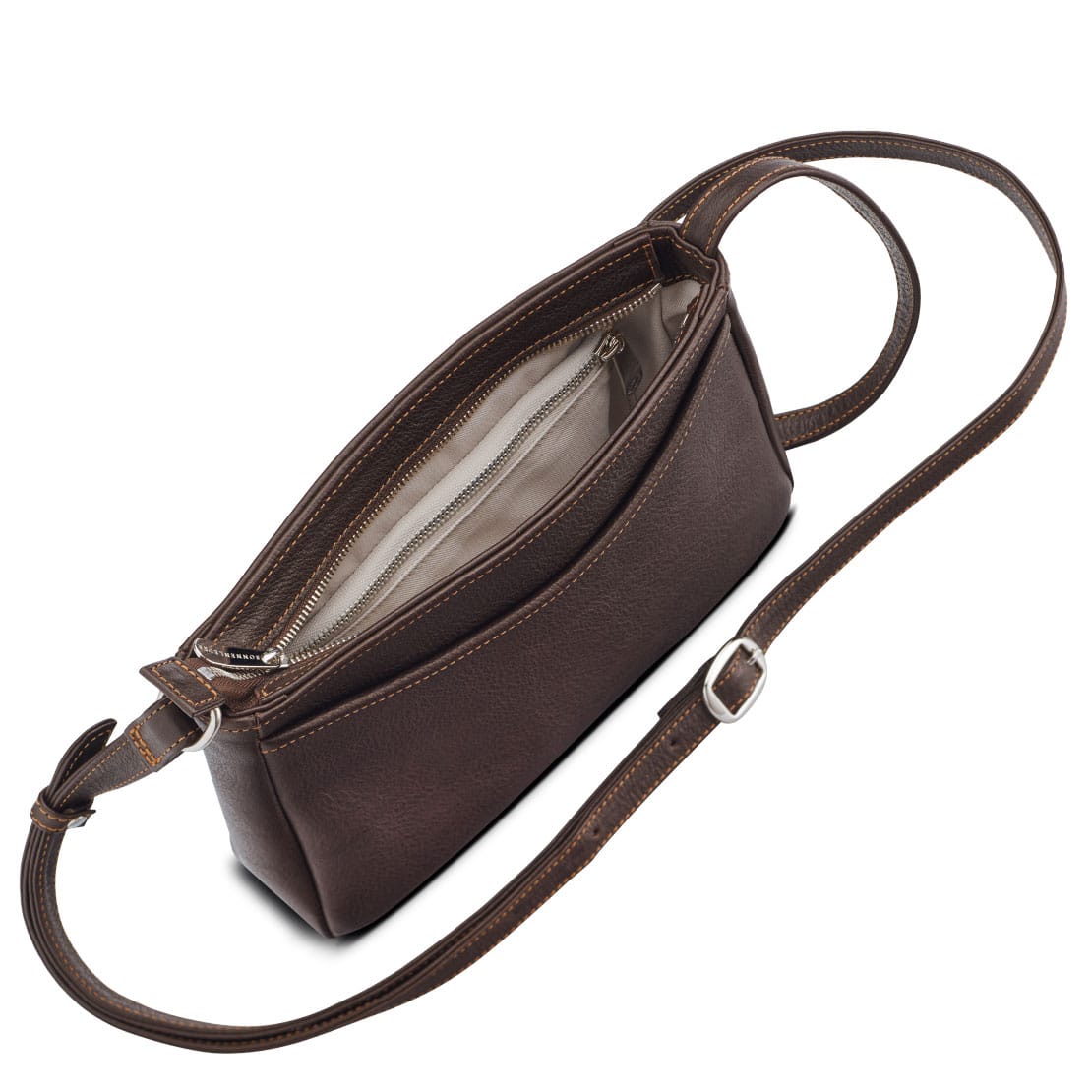 1 Hauptfach mit 1 zusätzlichen Reißverschlussfach ∙ verschließbar durch 1 Reißverschluss∙ 1 aufgesetztes Frontfach für Handy ∙ 1 durch 1 Metallschließe in der Länge verstellbarer Ledertrageriemen, 1,5 cm breit