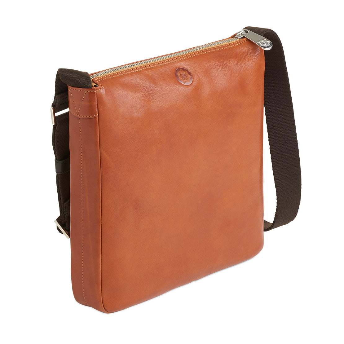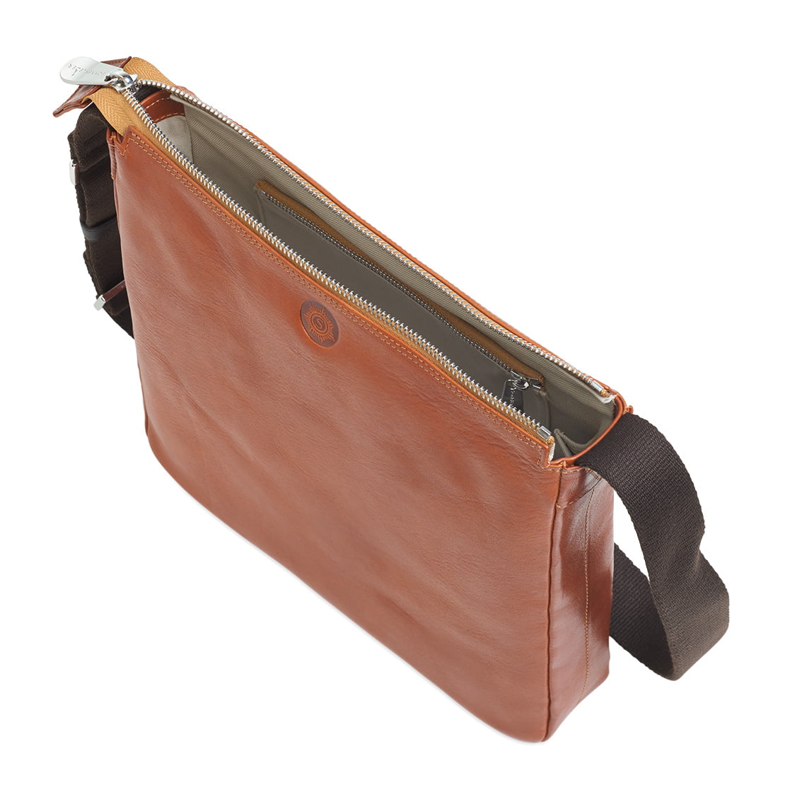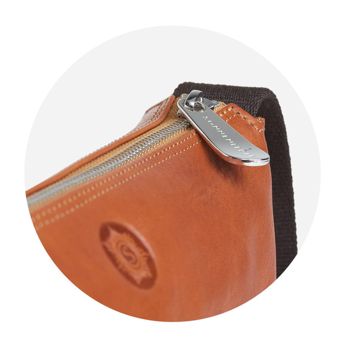 Süddeutsche Rindleder in Deutschland rein pflanzlich gegerbt, traditionelle Grubengerbung. Strapazierfähiges Köpergewebe. Polierte Premium Metall-Reißverschlüsse aus Deutschland. Beschläge aus Metall