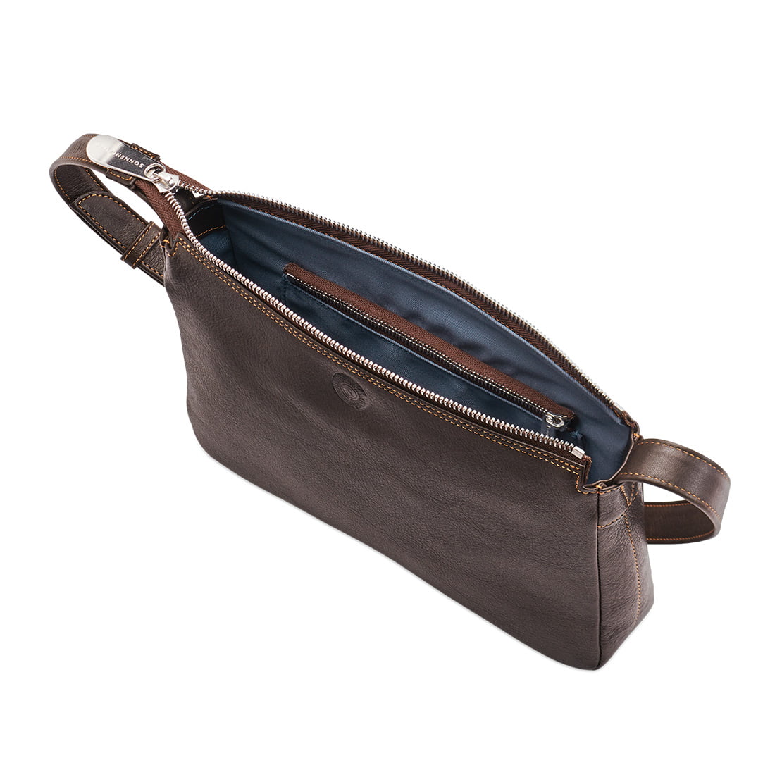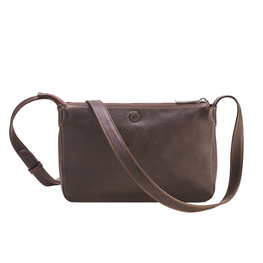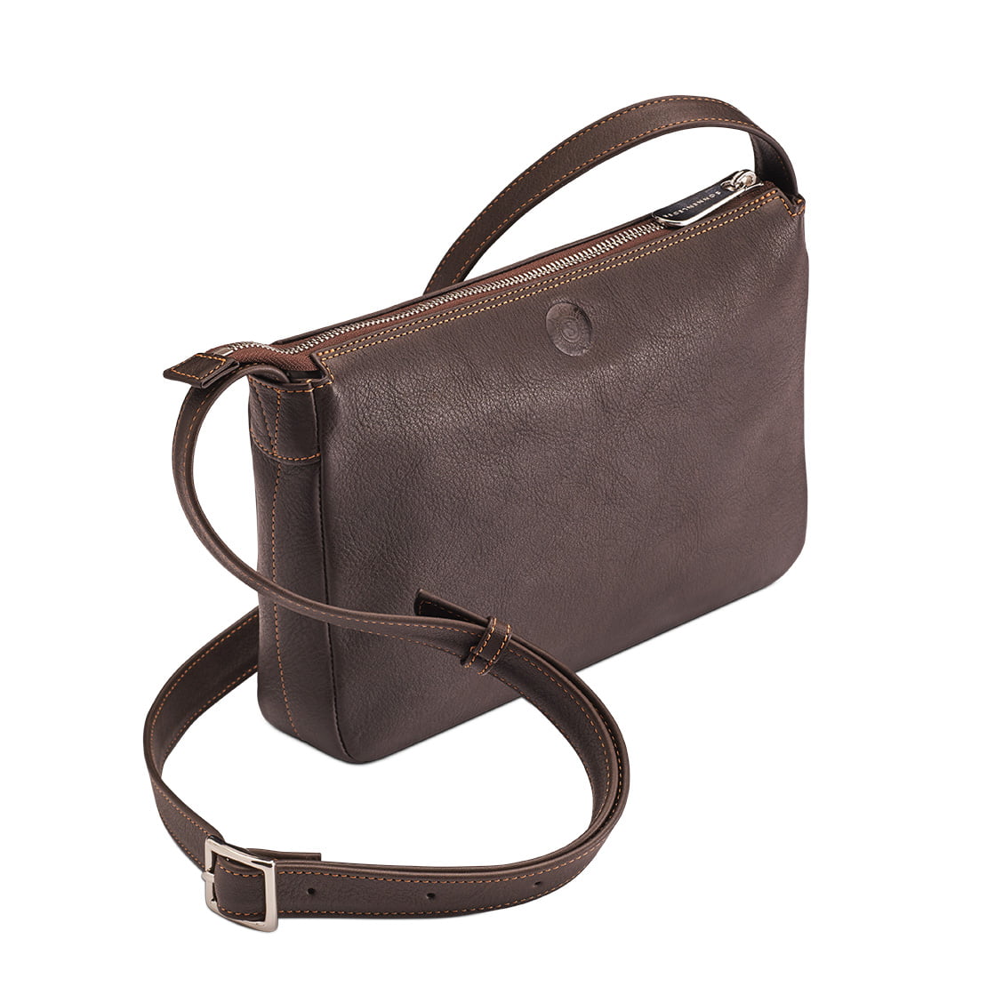 1 Hauptfach mit 1 zusätzlichen Reißverschlussfach, 2 Steckfächer für Telefon, Stifte, Geldbörse · verschließbar durch 1 Reißverschluss · verstellbarer Ledertrageriemen, 2 cm breit