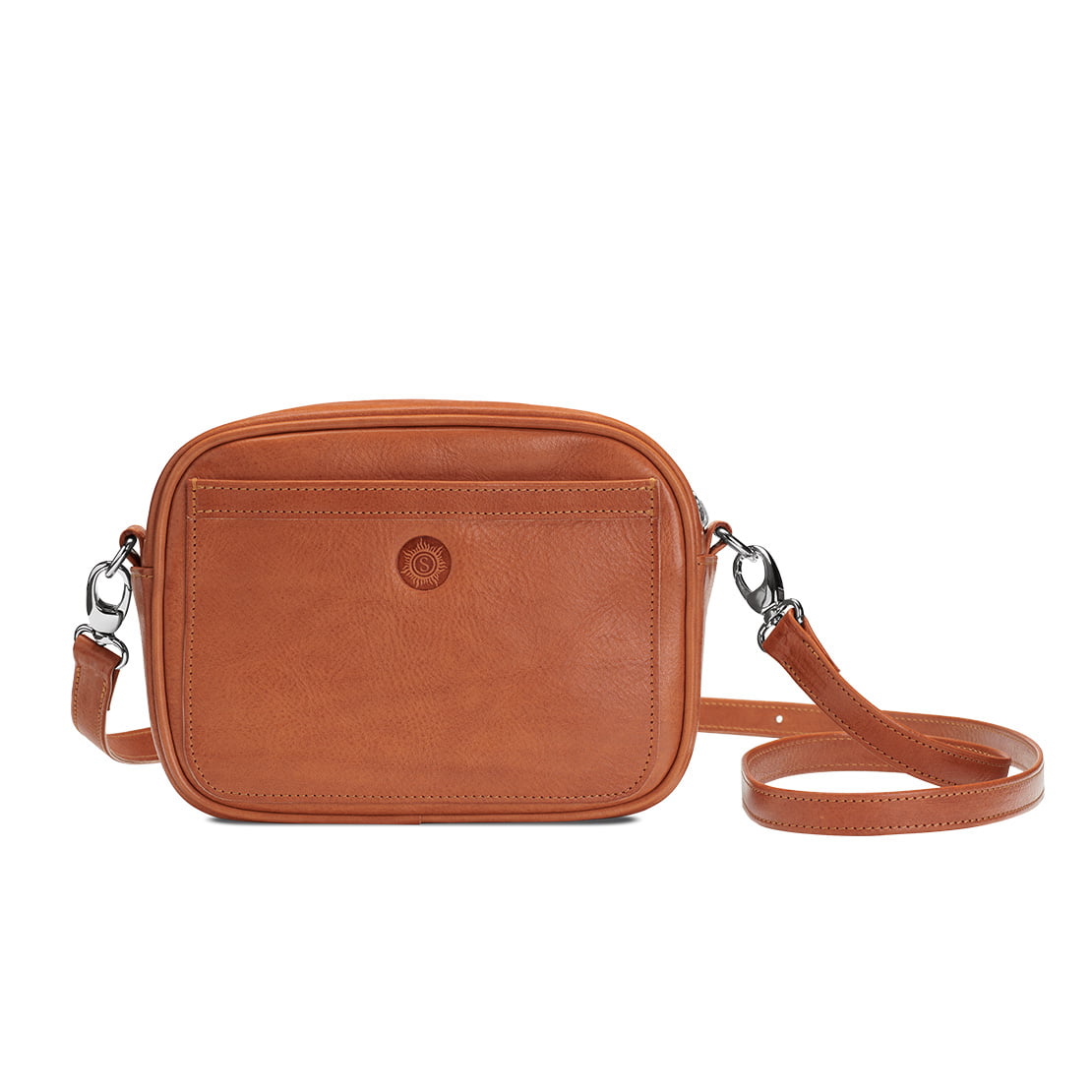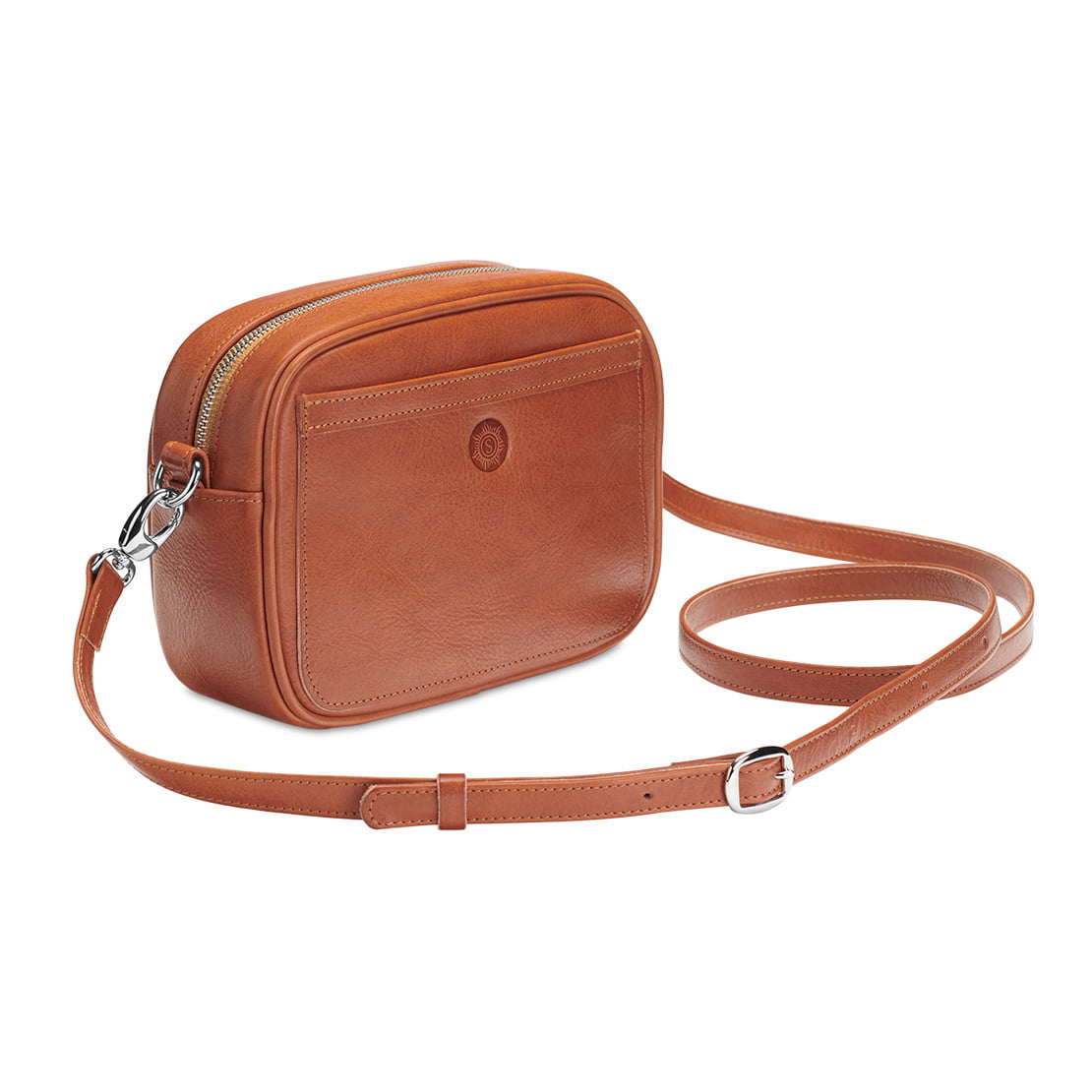 1 Hauptfach mit 1 zusätzlichen Steckfach · verschließbar durch 1 Reißverschluss · 1 aufgesetztes Frontfach · 1 durch 2 Karabiner abnehmbarer Trageriemen aus Leder 1,5cm breit, in der Länge verstellbar