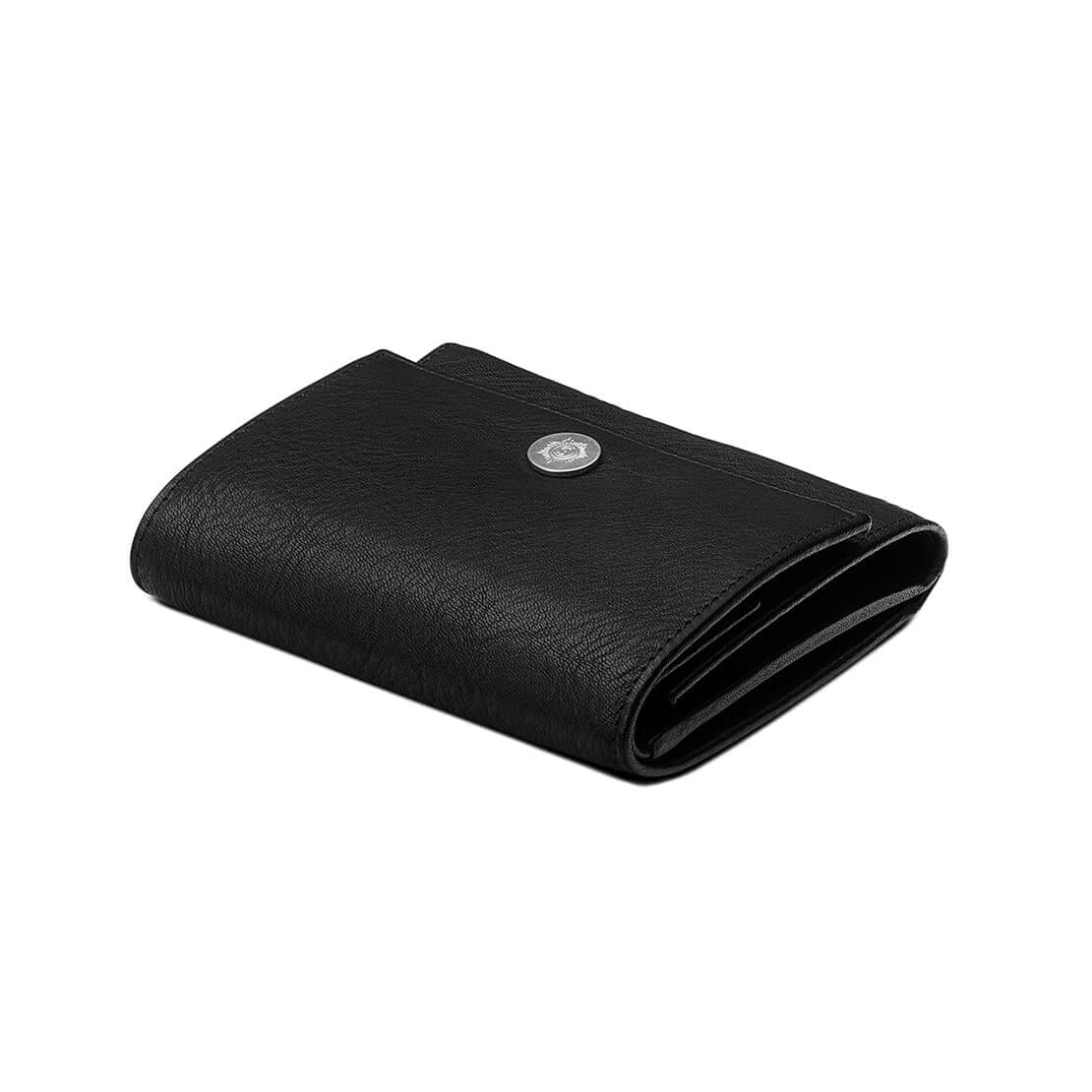 2 Geldscheinfächer, 1 großes Münzfach mit Zahlbrett, 1 Personalausweisfach, 1 Zettelfach, 6 Kreditkartenfächer, verschließbar durch Druckknopf
