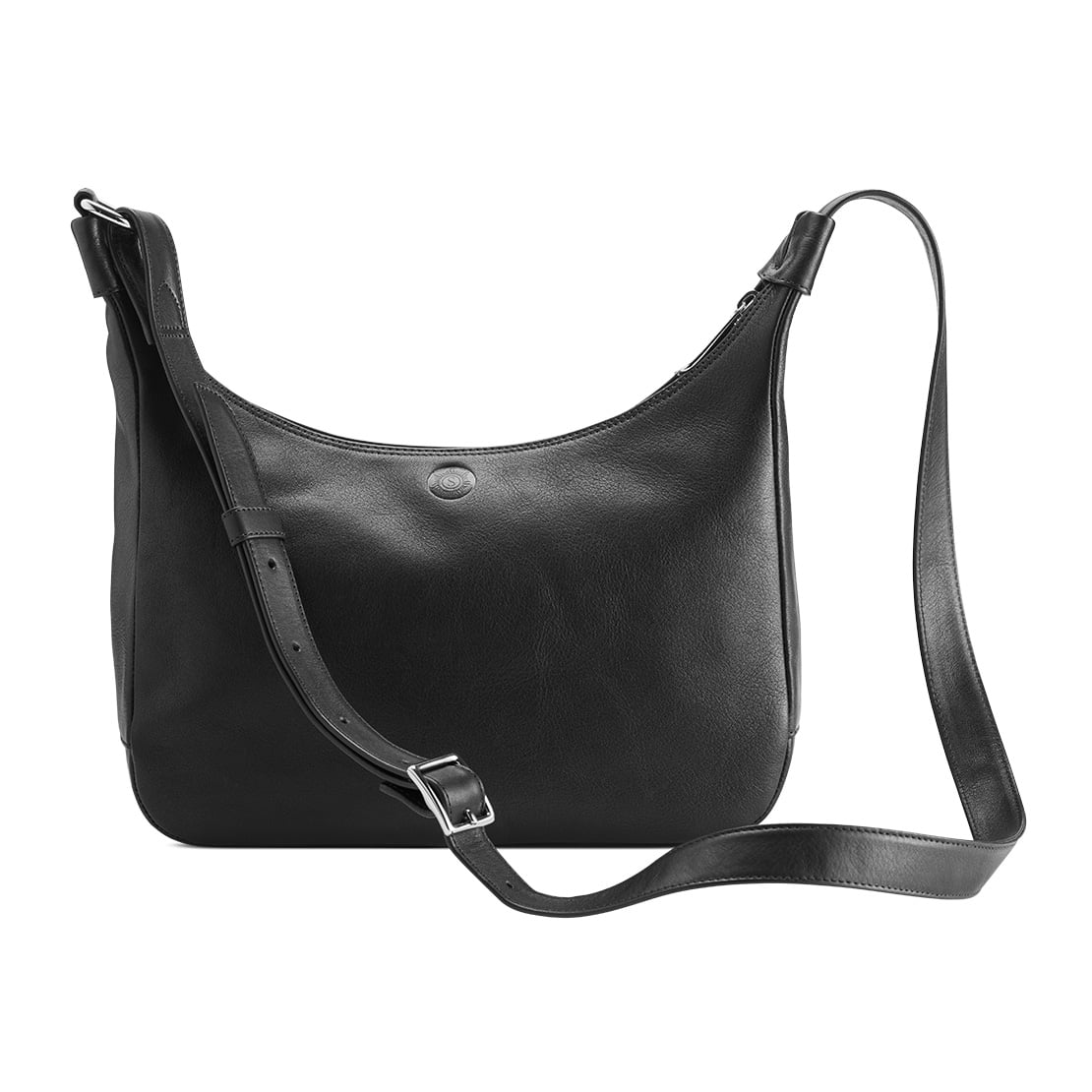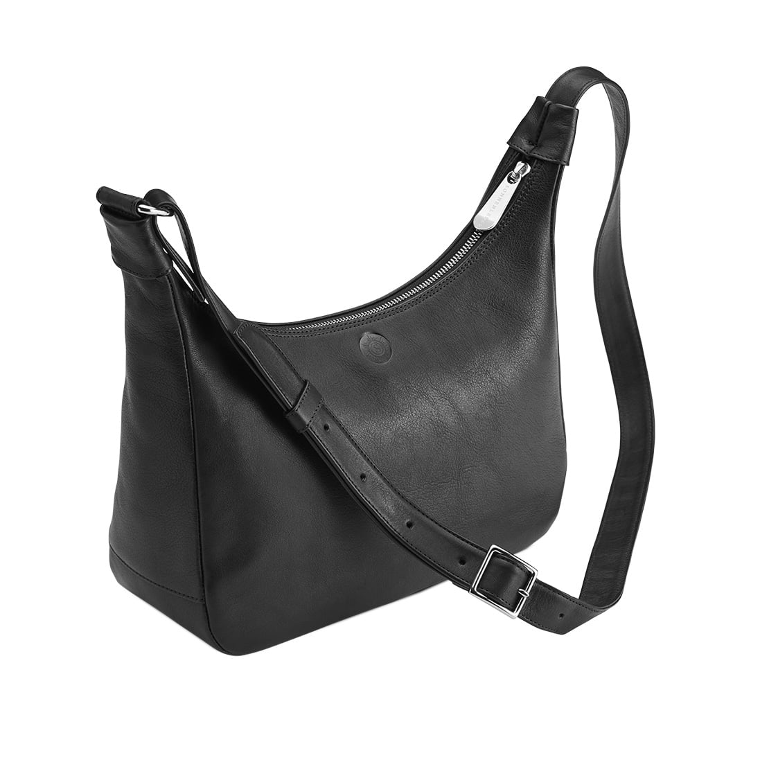1 Hauptfach mit 1 zusätzlichen Reißverschlussfach · 2 Steckfächer für Telefon, Stifte, Geldbörse · verschließbar durch 1 Reißverschluss · verstellbarer Ledertrageriemen, 2,5 cm breit · geeignet für A5-Unterlagen